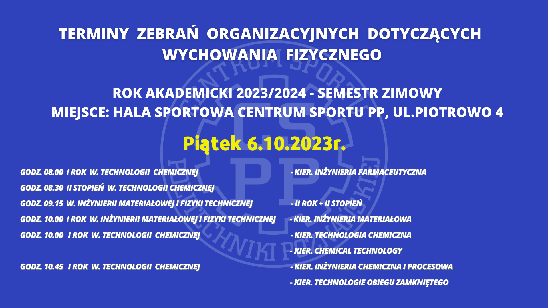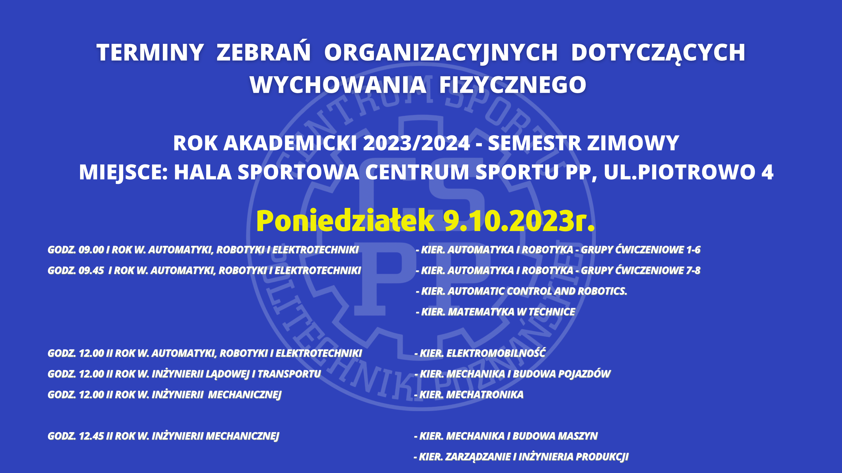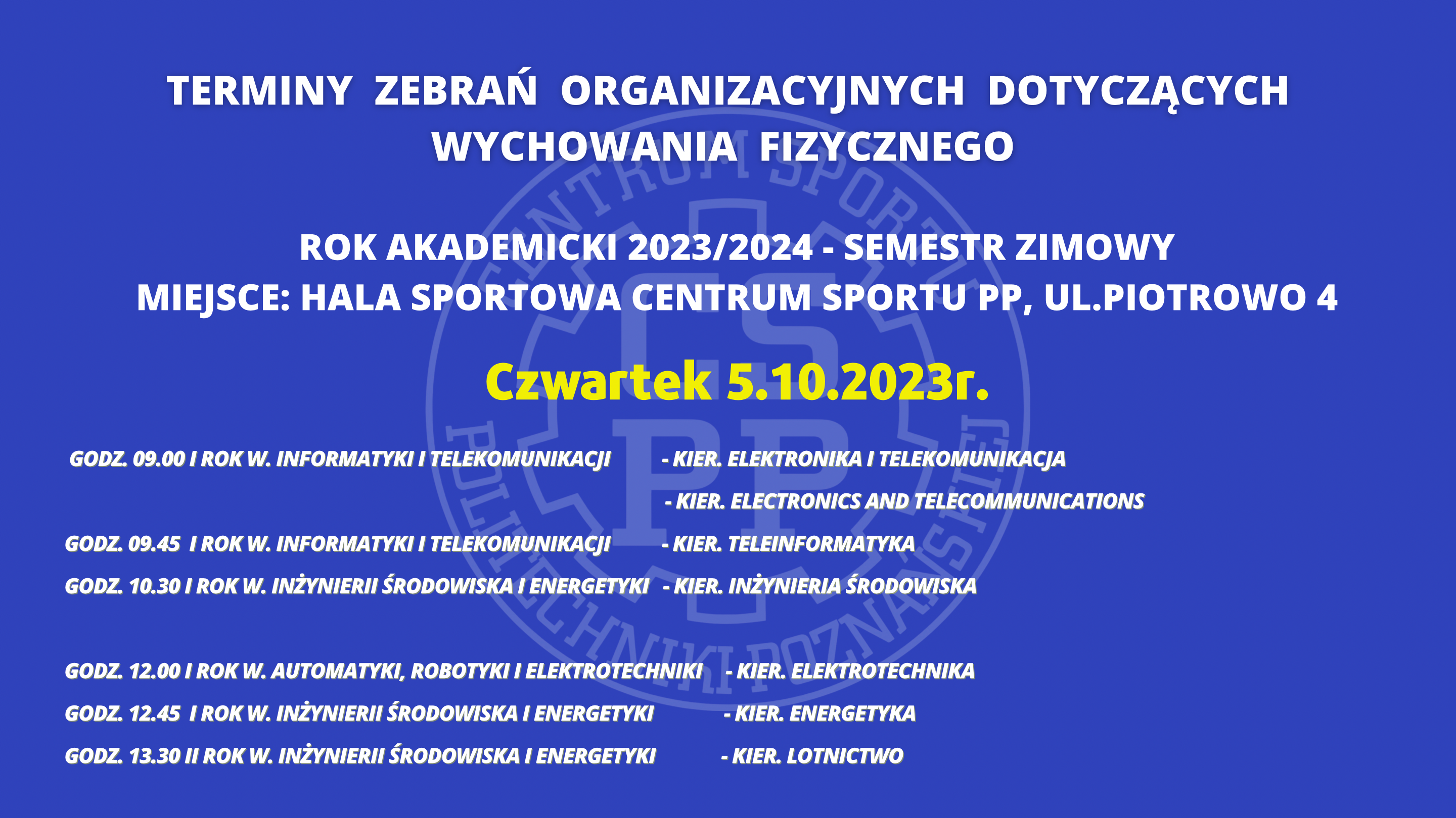 Data dodania 22.09.2023 Udostępnij: Zebrania informacyjne Przedstawiamy terminy zebrań organizacyjnych w poszczególne dni dla poszczególnych Wydziałów i kierunków studiów. Zebrania będą odbywały się w hali sportowej Centrum Sportu Politechniki Poznańskiej ul. Piotrowo 4. Language PL