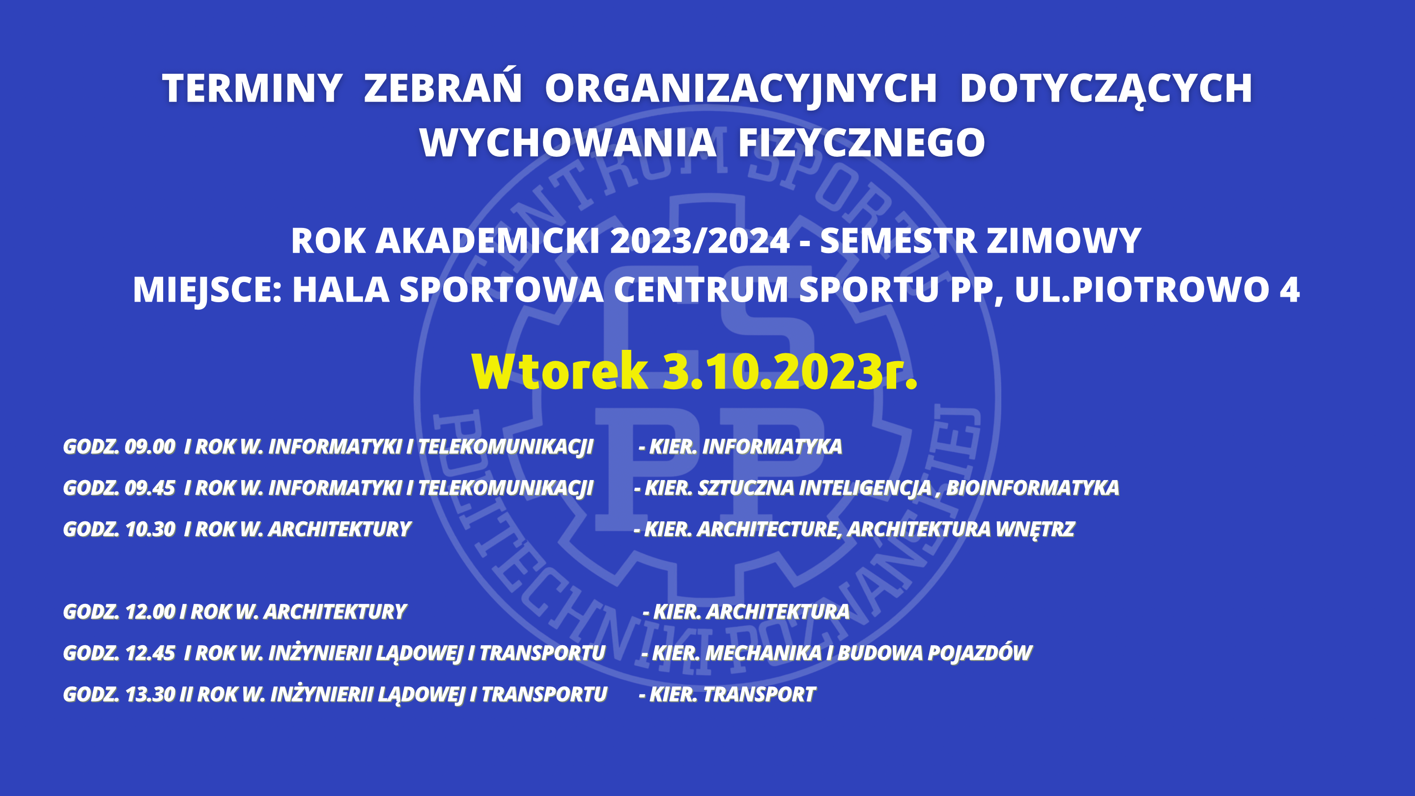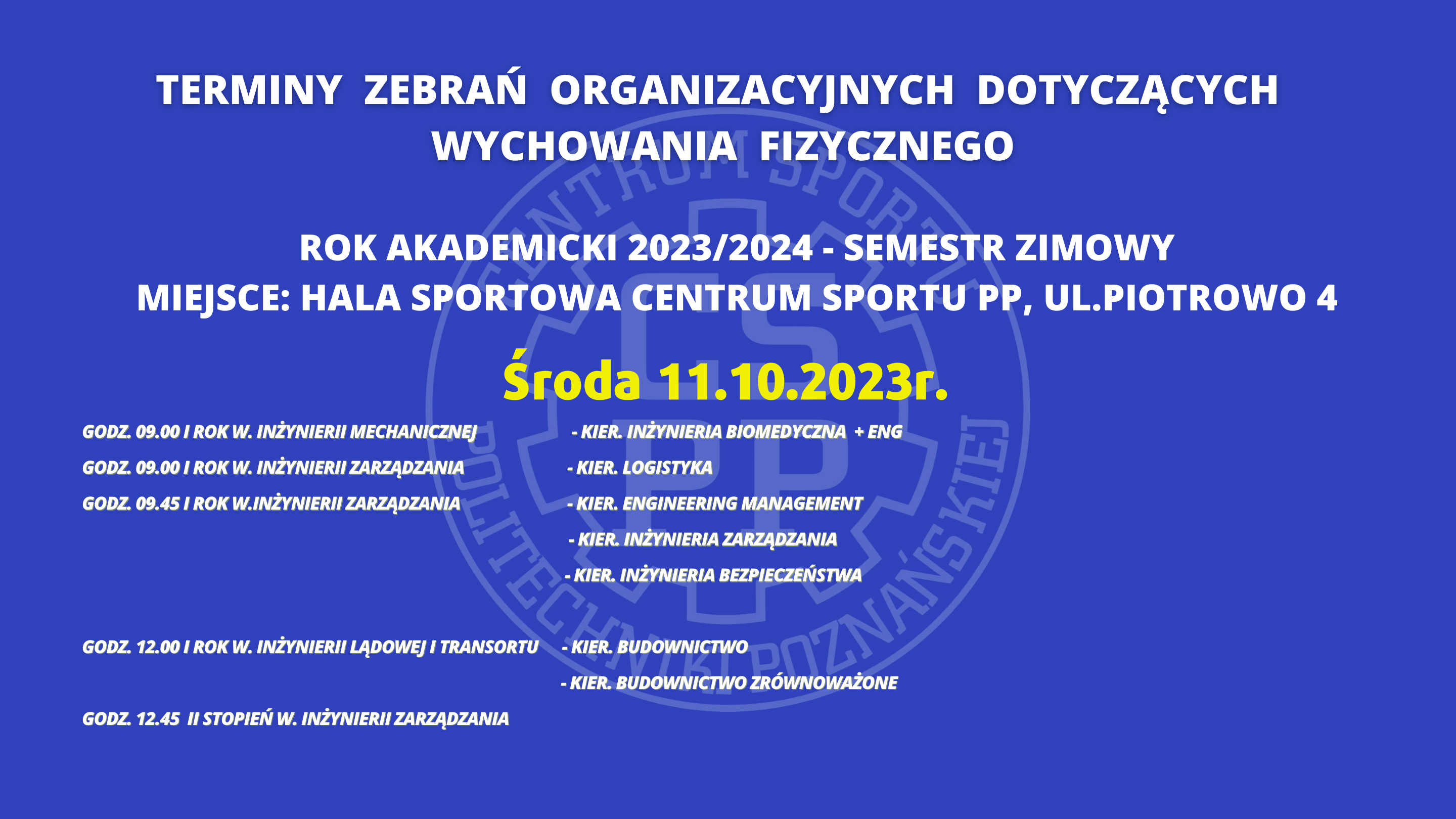 Data dodania 22.09.2023 Udostępnij: Zebrania informacyjne Przedstawiamy terminy zebrań organizacyjnych w poszczególne dni dla poszczególnych Wydziałów i kierunków studiów. Zebrania będą odbywały się w hali sportowej Centrum Sportu Politechniki Poznańskiej ul. Piotrowo 4. Language PL