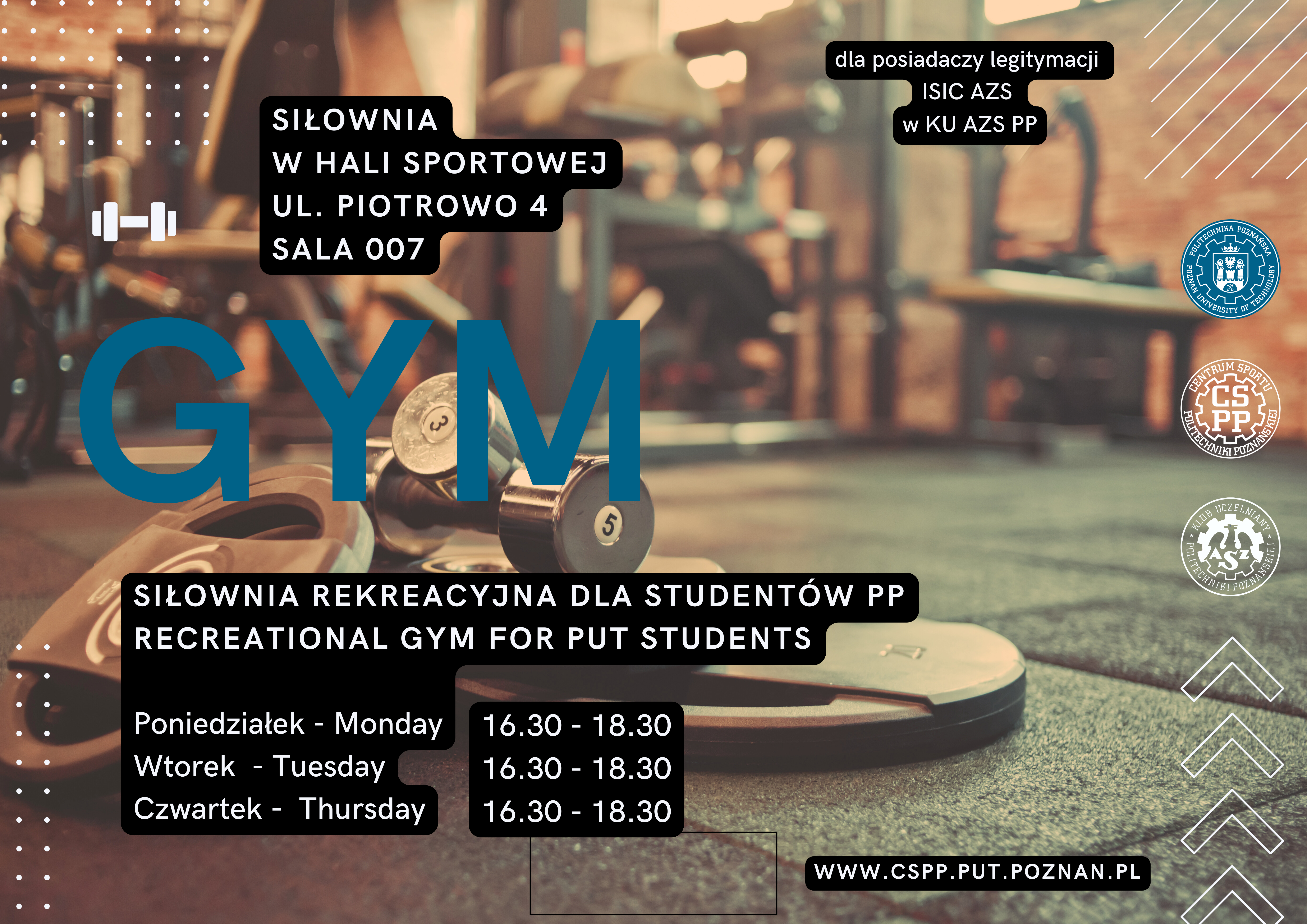 In order to attend the gym at the above times, you need to obtain an ISIC AZS card from the AZS PP University Club (this card also includes accident insurance - the https://www.cspp.put.poznan.pl/legitymacja-isic-azs)