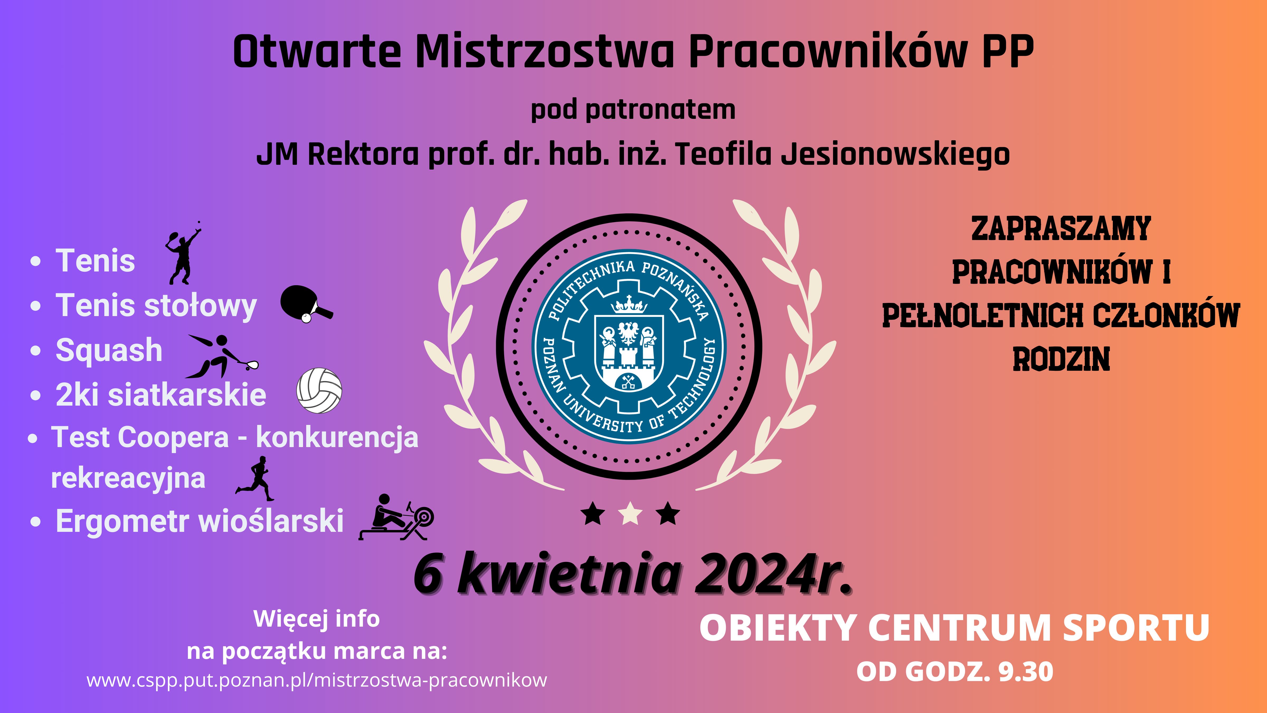 Data wydarzenia 06.04.2024 Udostępnij: Otwarte Mistrzostwa Pracowników Politechniki Poznańskiej Szczegóły niebawem